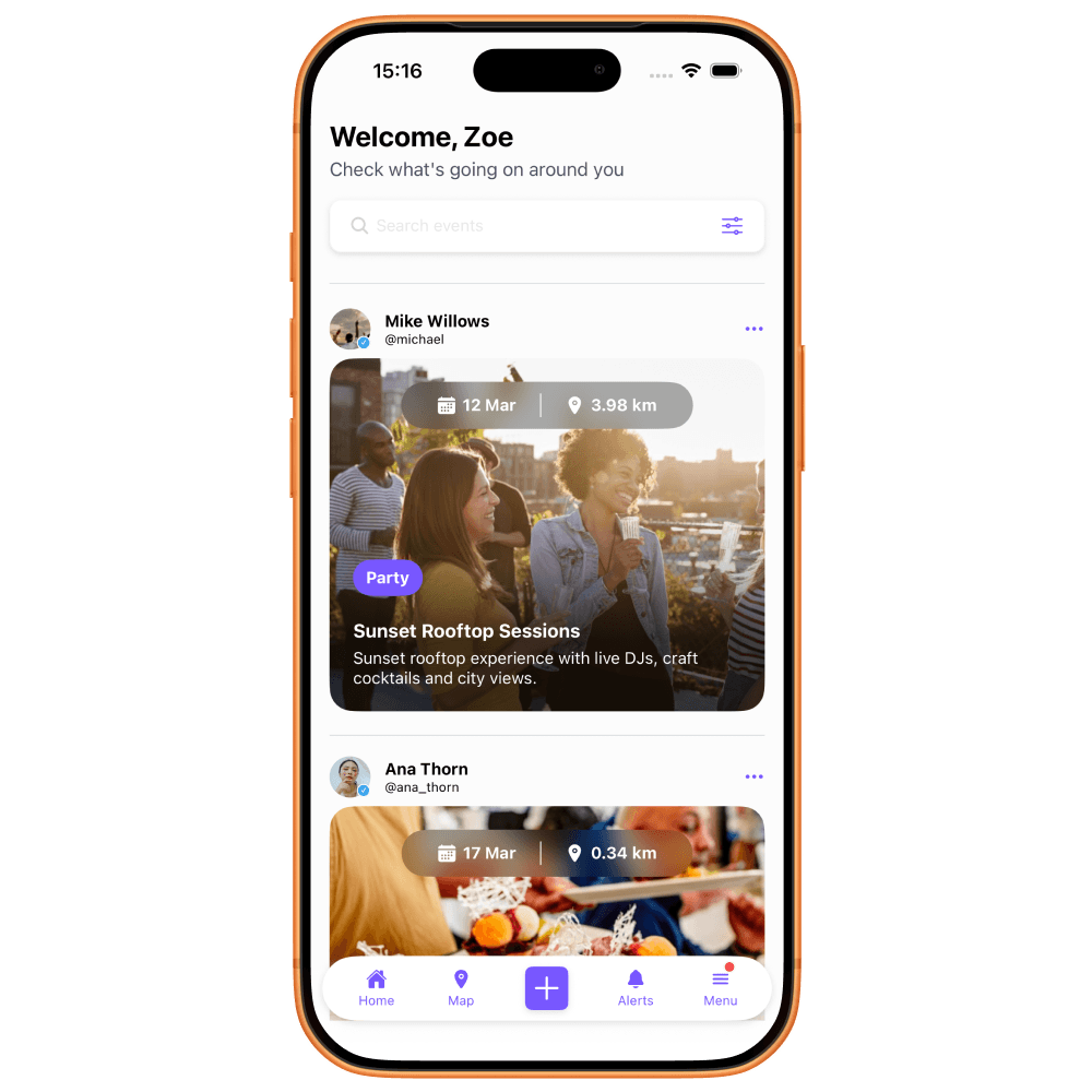 Feed, map, and filters surface the events and communities worth being part of.
